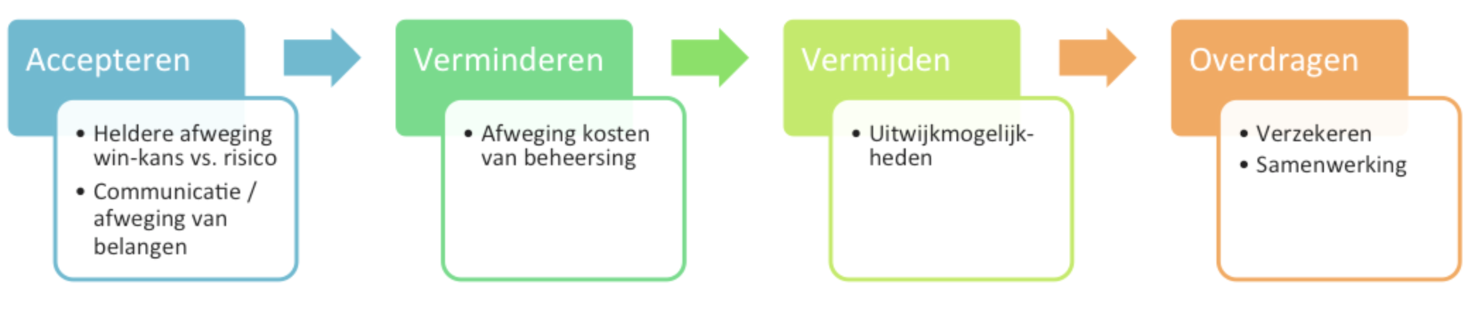 - Vermijden: er wordt actie ondernomen om het risico te weg te nemen, wat kan betekenen dat een project of activiteit wordt stopgezet