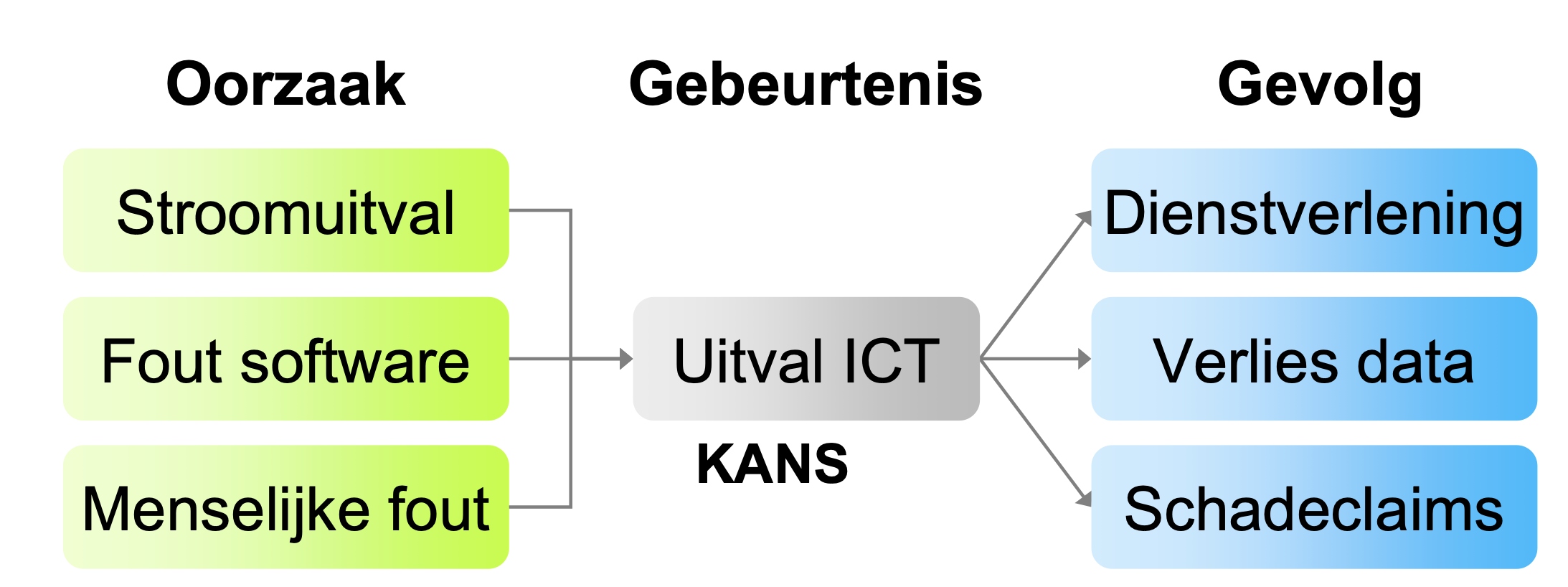 Na een training en het nogmaals nalezen van alle handboeken over risicomanagement wordt het vaak duidelijk dat risico’s bestaan uit een oorzaak, gebeurtenis en gevolg.
