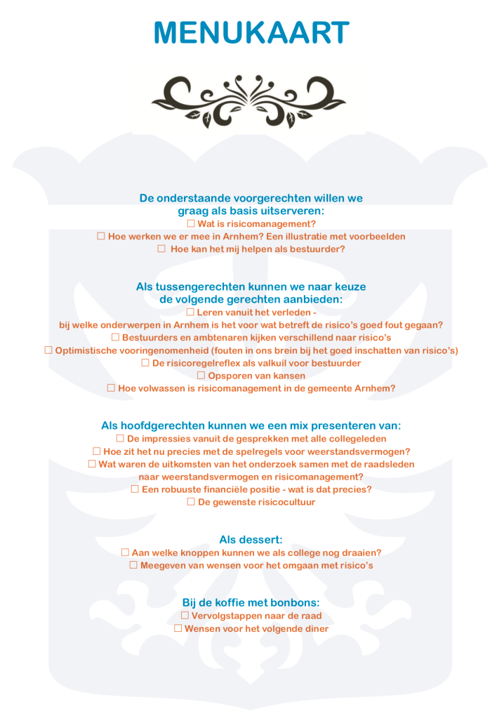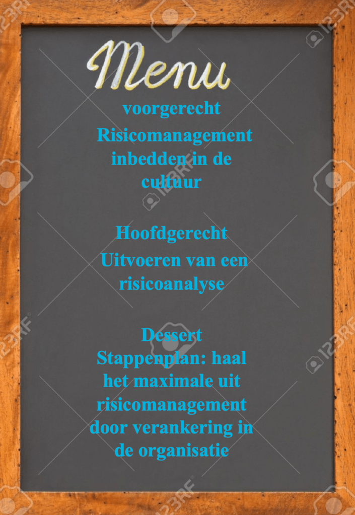 Om een grote organisatie te helpen risicomanagement aan het management te verkopen heb ik een keer deze menukaart risicomanagement gemaakt. Elke afdeling of project mocht (niet verplicht) haar eigen menukeuze maken. En er mocht buiten de P&C cyclus gegeten worden. ….