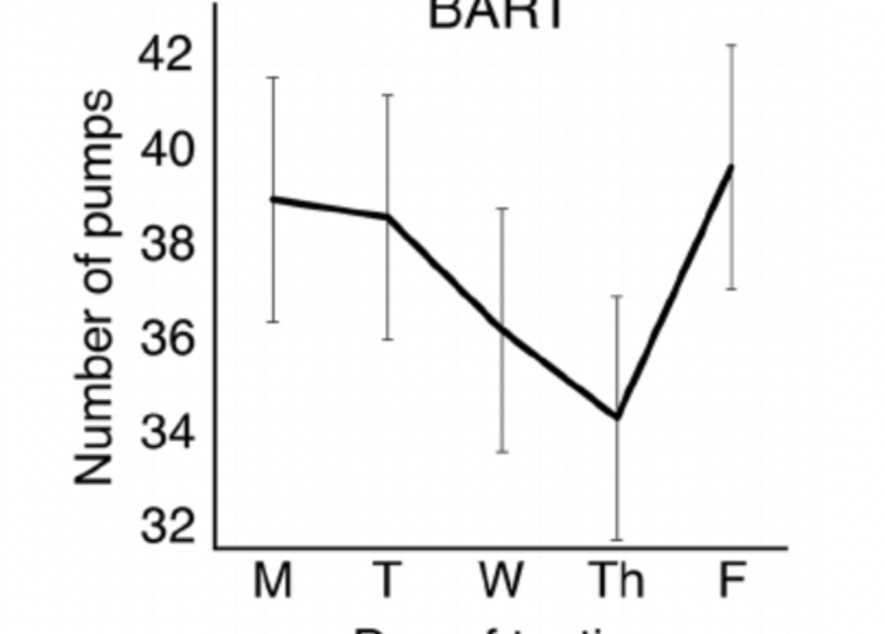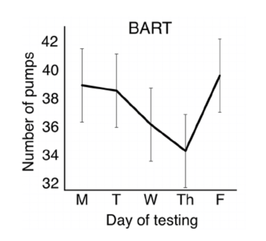 In dit gedragexperiment* verdienen de deelnemers geld door een reeks van twintig ballonnen op hun laptop op te blazen. Hoe groter de ballon hoe meer geld je verdient, maar als hij knapt krijg je niks. Dit experiment werd op elke dag van de week herhaald. Om een voorbeeld te geven: https://www.youtube.com/watch?v=iALrebfd1cc
