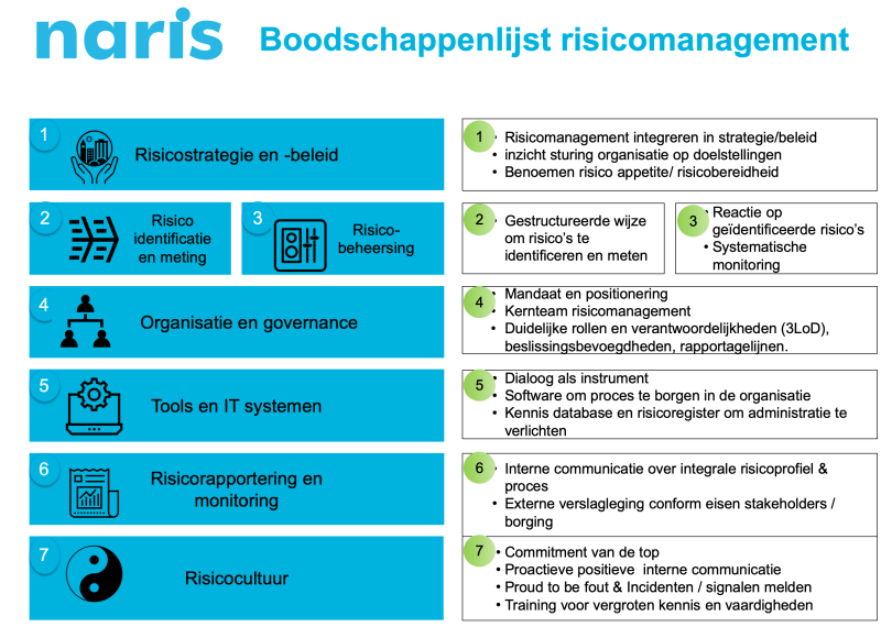 Maar wat heb je eigenlijk nodig om risicomanagement te laten leven in je organisatie? Daarom een boodschappenlijst risicomanagement met zeven belangrijke randvoorwaarden.